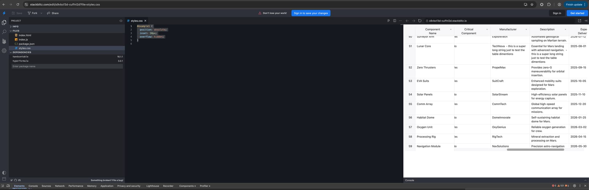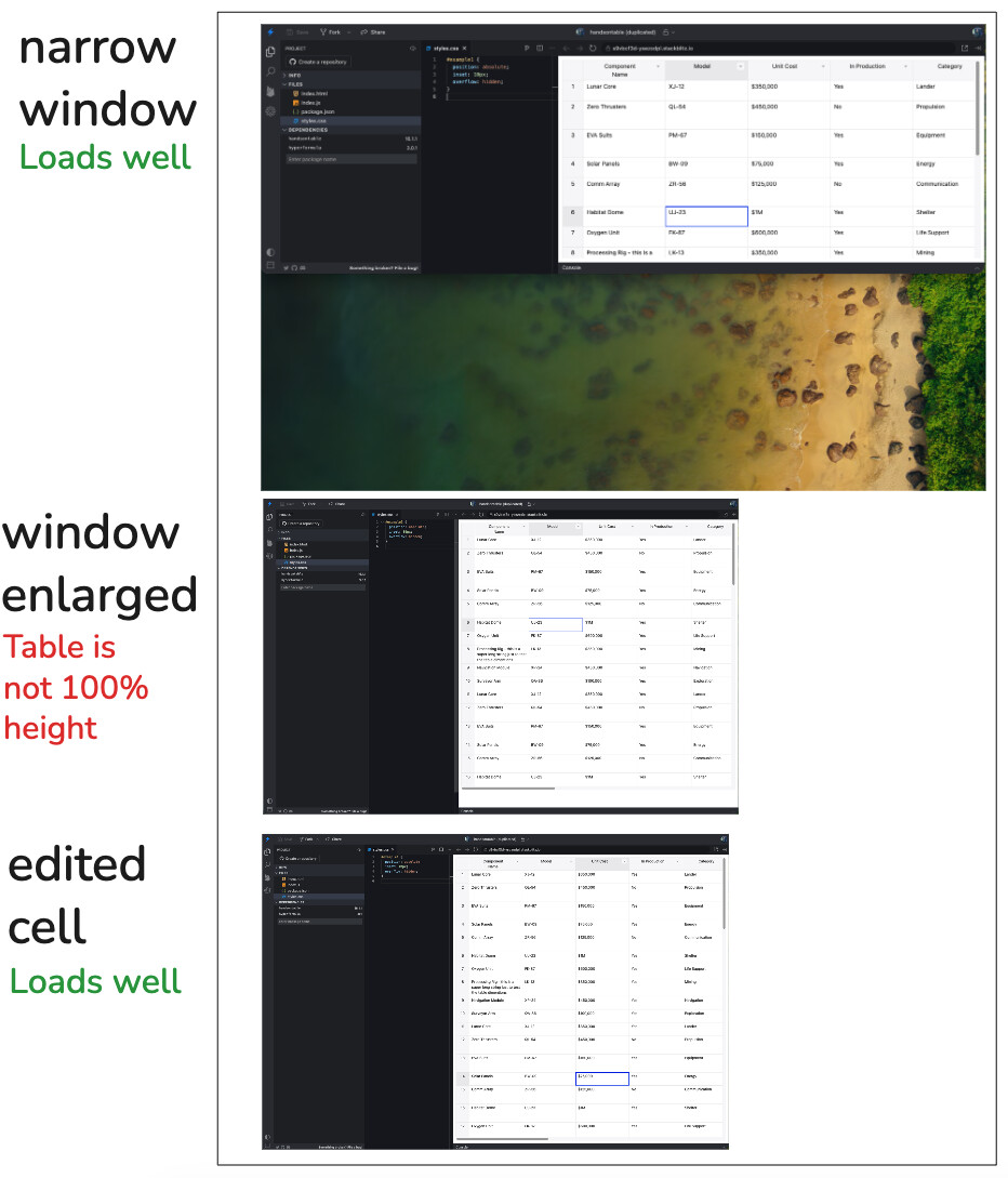 There isn’t a demo online to showcase the problem, but it’s fairly easy to reproduce in the js/demo example available in handsontable repository: Just remove the hardcoded height of 450, and position the #example div absolutely to take the entire screen with overflow: hidden.