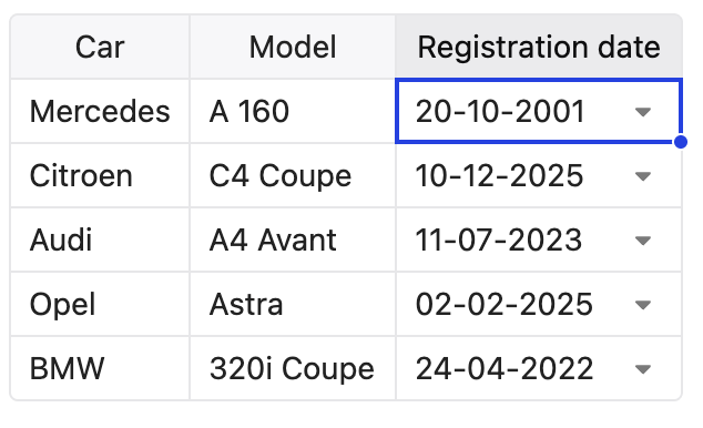 Now, when I want to pass a date that is different than the format as YYYY-MM-DD (here 2025-10-01), Handsontable tries to convert the data, but it can’t, so the value becomes 20-10-2001.
