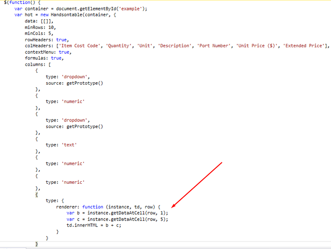 If you get the data from a database maybe it will be better to handle the SUM on the back-end (just store it as well). The case is when we use a renderer it doesn’t add a value to the cell. It only ‘makes it appear’. That’s why when you edit the cell the value of 7 is not there in the editor and it doesn’t load by calling getData and getSourceData.