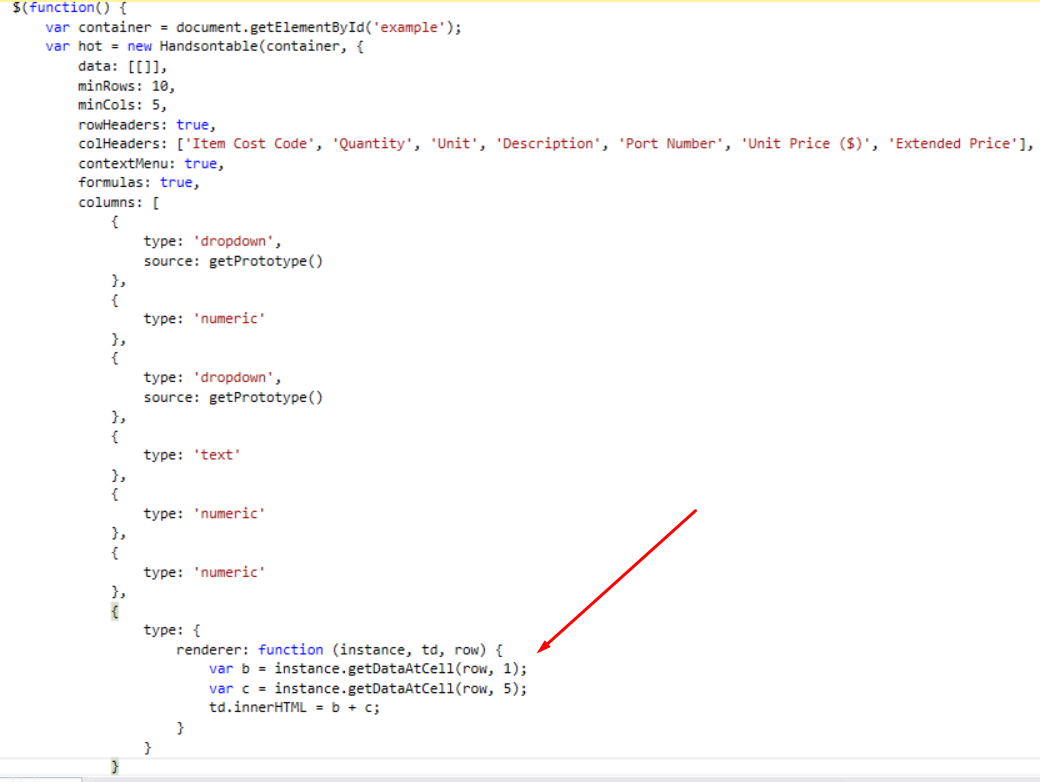 After the table is initialized with the Quantity and Unit price columns call the setDataAtCell for Extended Price column and check if it works as expected. Theoretically, it should work fast and surely will return 7 in the getData method.