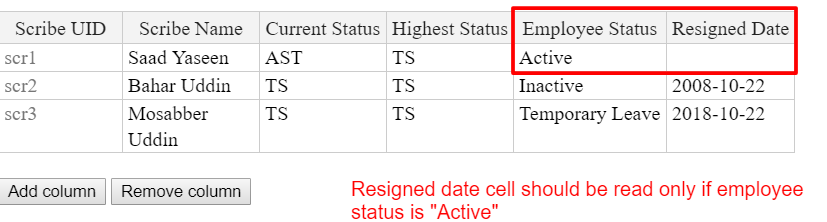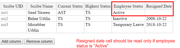 When the “Active” option under the Employee select box is displayed, the resigned date blank cell next to it must be read-only. For other options, the resigned date cell my be editable.