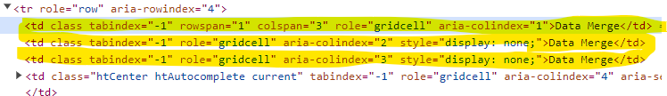 In the DOM, we have different results as the mergeCells plugin creates a layer of cells on top of the actual grid.