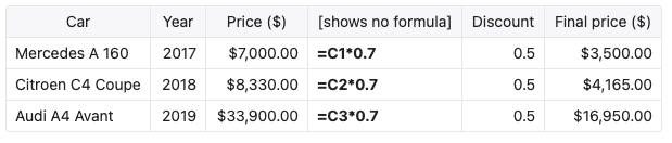 Evaluating the formula under the hood is not such a big problem for me because I’m going to send the source data to the back-end anyway. The problem is that, if we did something like =D1\*E1 (D1 being the cell that “shows no formula”), D1 here would still be a number calculated from the formula =C1*0.7, so =D1\*E1 would be: 4900 times 0.5 (4900 being the result of C1 times 0.7).